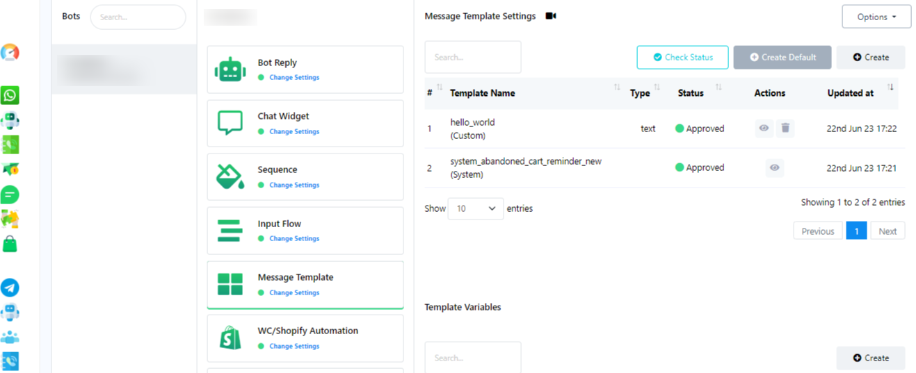 - Go to WasapChatbot Dashboard and navigate to the Bot manager section.